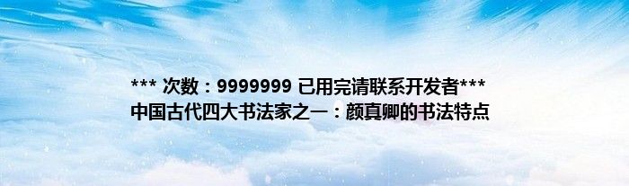 本文*** 次数:9999999 已用完请联系开发者*** 中国古代四大书法家之一:颜真卿的书法特点到此分享完毕,希望对大家有所帮助。