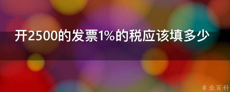 开2500的发票1%的税应该填25元。应纳个人所得税税额=(应纳税所得额-扣除标准)适用税率-速算扣除数=(2500-1600)10%-25=65元,其中扣除标准1600元/月,不超过500元的,税率5%,速算扣除数为0;超过500元至2000元的部分,税率10%,速算扣除数为25元。