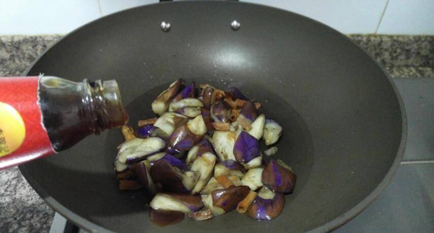 8、放入酱油和蚝油,翻炒至茄子软烂。