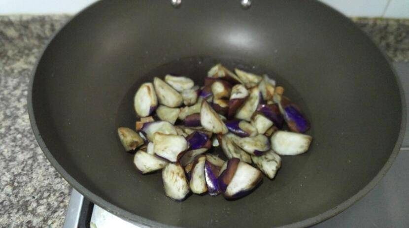 4、中小火热锅,放入茄子翻炒。