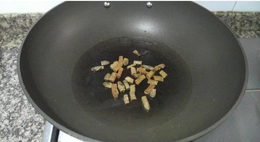 6、锅内热油,放入沙虫干小火慢慢翻炒至深黄色。
