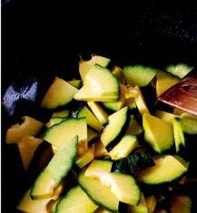 牛腿瓜洗净切块。热锅放油,少许大葱炝锅,待油温上升放入牛腿瓜翻炒。