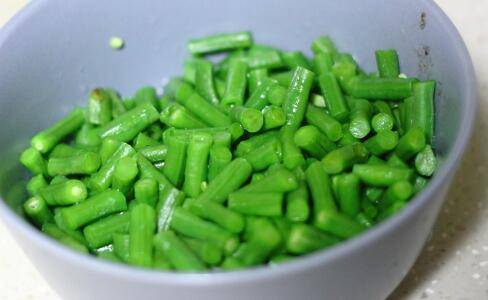 豇豆清洗干净后切成1.5cm左右长的段,放开水锅里焯水1分钟左右捞出,捞出的豇豆马上过冷水并沥干水分。
