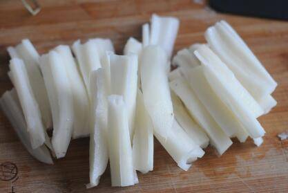 莲藕去皮后切成条。