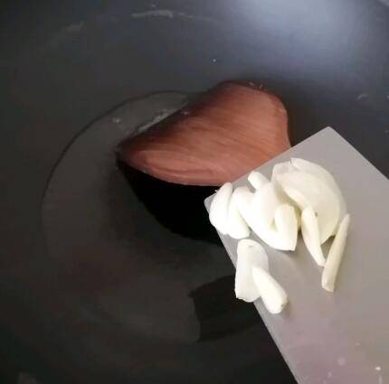 3、油热后下蒜头。