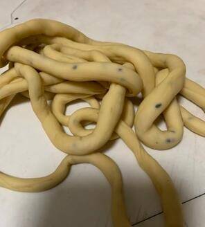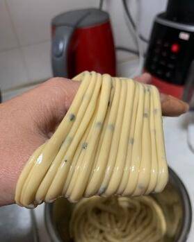 隔天将细长条面团继续拉长、拉细。