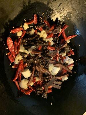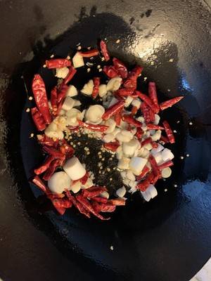 4、先把辣椒、葱、蒜下锅,小火爆香。