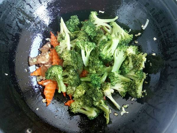 用料:猪肉少许、西兰花半个、蚝油1汤勺、红萝卜、料酒少许、葱10克、蒜1瓣、姜6克、干红辣椒2个、八角2瓣、花生油10毫升、盐少许、胡椒粉1.5克。