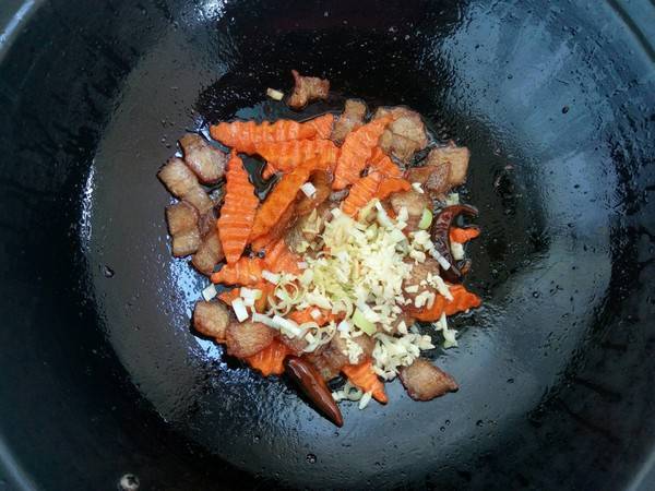 2、红萝卜洗净去皮,切成片。葱姜蒜均切粒。