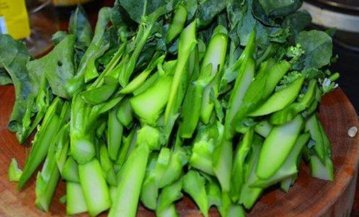 2、把洗净的芥兰斜着切成薄片状,但也不用太薄了,这样切炒出来的芥兰不会苦(注意把杆和叶分开)。