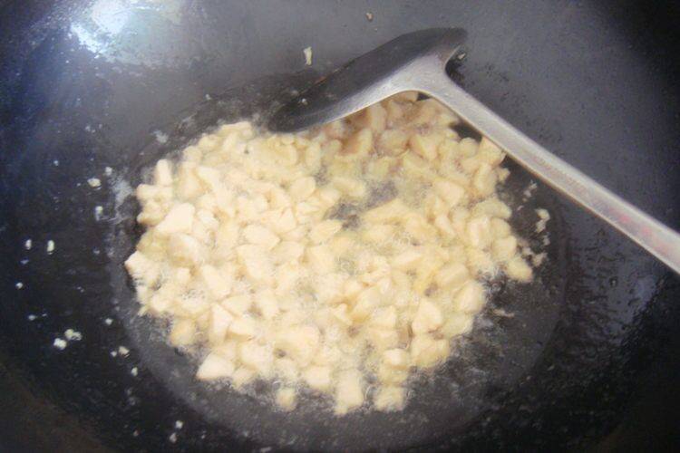 5、锅内下油,要多些,将腌好的鸡丁入内炸。