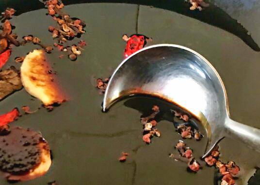 2、将香料和冰糖、白糖放入锅中。