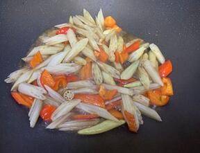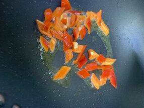起油锅煸香彩椒片。