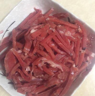1、牛肉或者猪肉切成丝备用,青萝卜切丝备用。