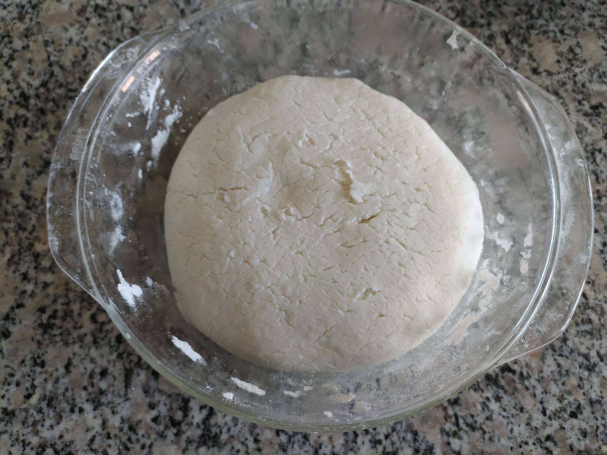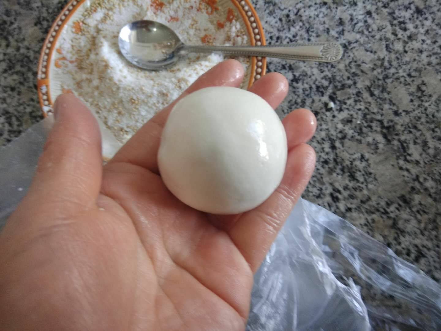 5、捏紧,手上沾上少许清水,将面团搓圆后按扁。