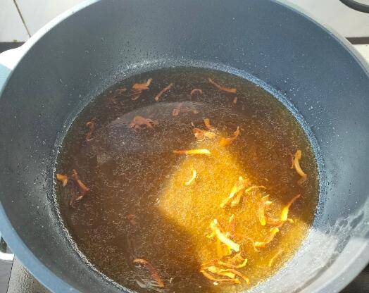 3、放入冰糖,中小火炒至融化。