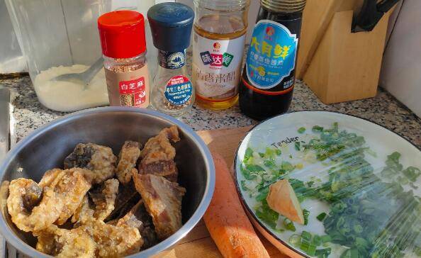 用料:炸老板鱼1盘、植物油少许、葱花少许、姜丝少许、胡萝卜丝少许、冰糖20g、蒸鱼酱油1勺、清香米醋2勺、熟白芝麻少许、淀粉1勺。