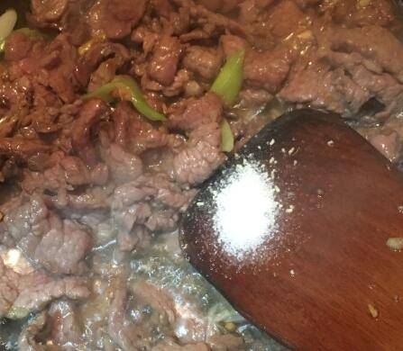 倒入牛肉大火不停翻炒,炒至颜色变白,调入盐和鸡精翻炒均匀。