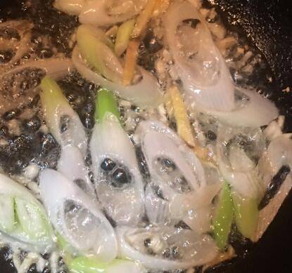 锅中加入油,大火烧热,放入蒜末,姜丝和1/3的大葱,煸出香味。