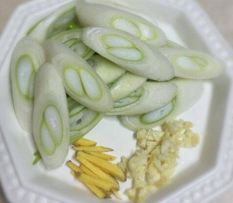 大葱切片,生姜切丝,蒜头切碎备用。