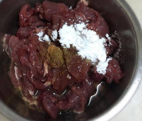 牛肉洗净沥干水分,切薄片,放入碗中,调入酱油和孜然粉,再加入玉米淀粉和1小勺食用油,用手抓匀备用。