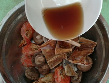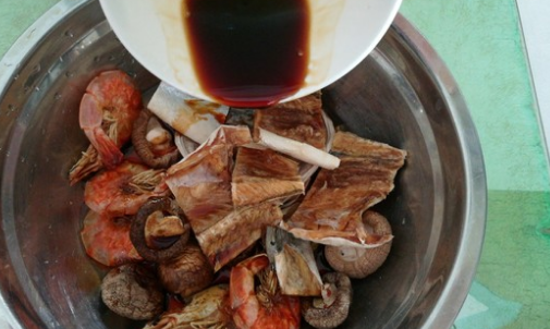 2、将鲈鱼干用剪刀剪成小块;将海虾干、香菇干和鲈鱼干一起放入小盆中,然后放入适量生抽。