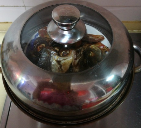 5、充分浸泡一段时间,让鱼干变软一点充分入味,然后将鱼干放入盘子中,汤汁倒掉,然后将盘子放入蒸锅中。