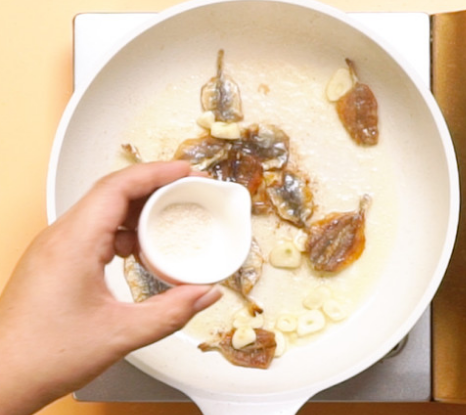 4、食用油5ml, 倒入蒜片,鱼干,翻炒均匀,生抽10克,鸡粉2克。