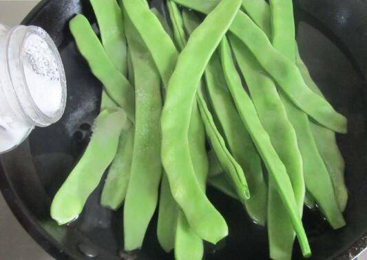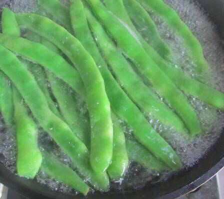 炒之前再加入少许油,拌均匀;锅中放入少许盐和几滴油,将四季豆放入里面焯煮。