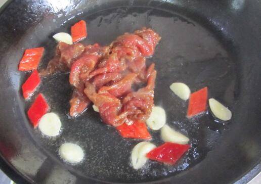 热锅凉油,放入蒜片和红辣椒片进去翻炒。