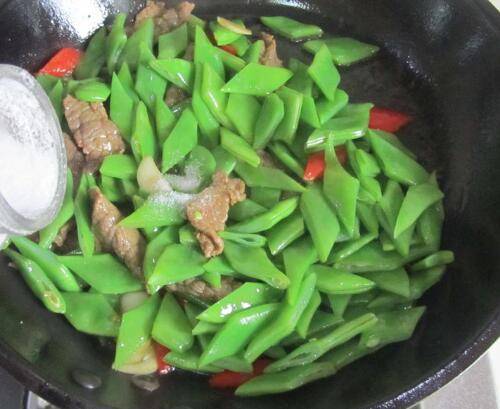 微微出香味后加入腌制好的牛肉进去翻炒;牛肉微微变色后加入切好的四季豆片进去翻炒。