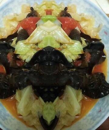 西红柿去皮切块过油备用,油热后放入圆白菜和木耳翻炒。