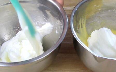 5、取蛋白,跟蛋黄糊混合,翻拌均匀,放烤箱烤15分钟即可。
