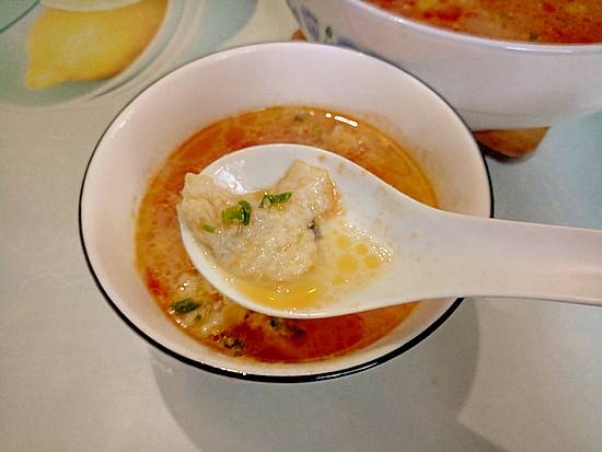5、水烧开后,下鱼片,迅速用筷子扒散开。