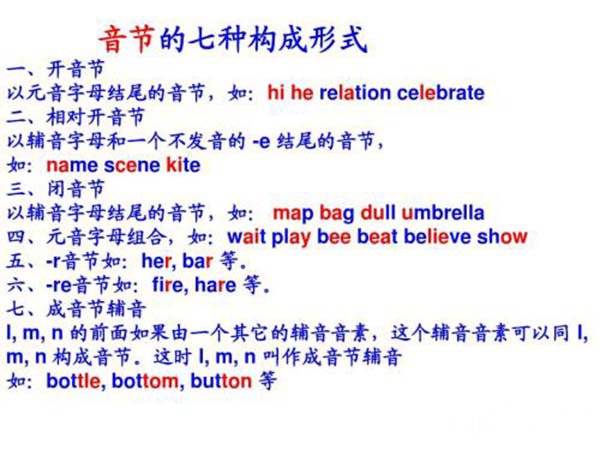 3、音节:音节是读音的基本单位,任何单词的读音,都是分解为一个个音节朗读。在英语中元音特别响亮,一个元音音素可构成一个音节,一个元音音素和一个或几个辅音音素结合也可以构成一个音节。一般说来,元音音素可以构成音节,辅音音素不响亮,不能构成音节。