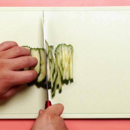 1、准备食材:黄瓜丝70克、紫甘蓝300克、白芝麻4克、盐2克、白砂糖3克、生抽15克、醋15克、香油5克。