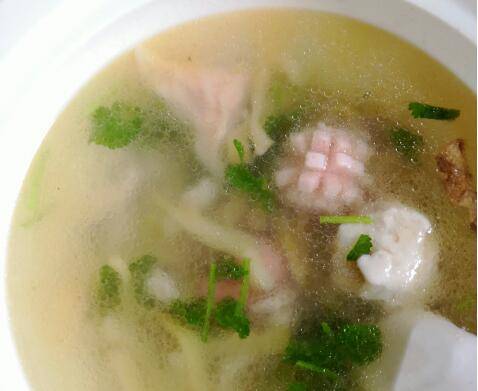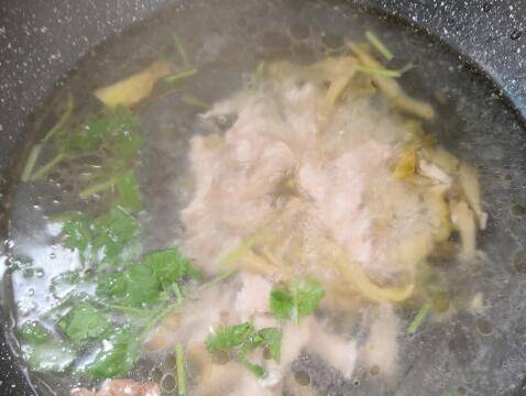 等到水沸腾,打开锅盖,加入焯过的肉丝和切好的香菜,最后放入适量盐和味精,大概两分钟左右立刻关火。这样能最大保持肉丝的软嫩,榨菜丝的爽脆。