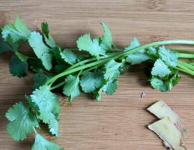 香菜洗净切成段,姜片切两三片,备用。