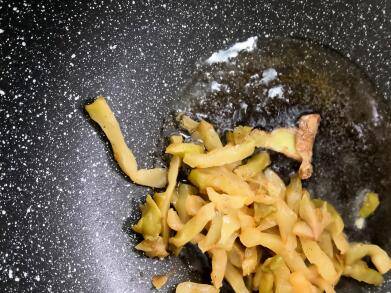 锅中放入食用油,放姜片炒出姜味,起到去腥的效果。再放入榨菜一同翻炒一会儿,锅中加入水。