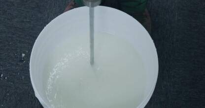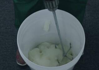 使用电动搅拌棒对桶内未加水的糯米胶进行第一次搅拌;
