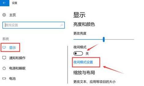 2、进入显示设置页,右侧可看到夜间模式开关,通过切换即可按照设置的规则,启动此模式,这里点击开关按钮下方此模式设置按钮。