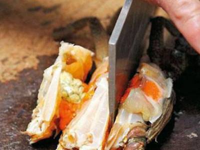 5、剁掉蟹头的触角和第一节的蟹脚部分。把螃蟹从中间一分为二剁开,再根据个人烹调的需要切成小块即可。