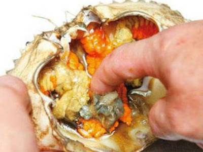 2、剥开螃蟹的外壳后,把黏附于螃蟹外壳中央的食胆清理干净。