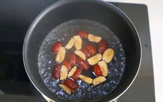 5、锅中放清水,红枣去壳切开放入水中先煮3-5分钟,煮出枣香。