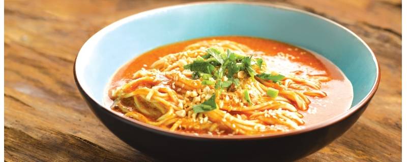 4、四川的担担面。四川担担面的精华,就在调料的麻辣鲜香。传说担担面来源于四川当地的挑夫们,因为面条是用扁担装着,扁担一边是煮面的汤锅,另一边是加入面条里的调料,所以有了担担面的叫法。想要吃四川担担面,不仅要能吃辣,还要能吃麻。