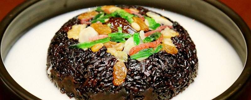 2、黑糯米八宝饭:特色美食,软糯香甜,滋补佳品。糯米要浸泡“过心”,否则蒸不熟,碗中藕粉要先用冷水调稀。
