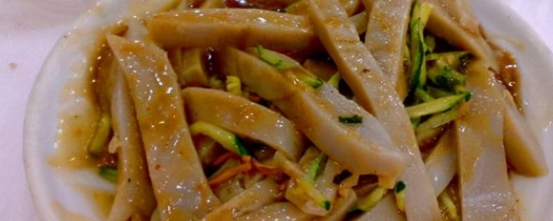 5、灌掌:灌掌是一种荞麦制品,邯郸外有的地方也称为扒糕。将灌掌切成小块,再将小块削成两头薄中间厚的长条薄片盛在碗内,浇上用麻酱、酱油、醋搅拌的汁食用即可,是很多邯郸人喜欢的地方小吃。