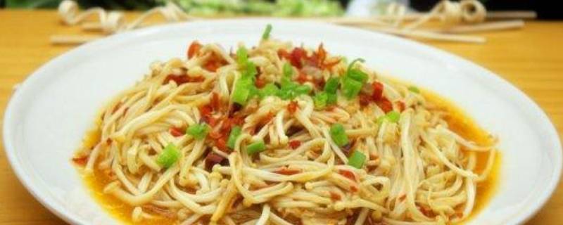 7、放入金针菇和红椒翻炒,加入食盐炒入味。
