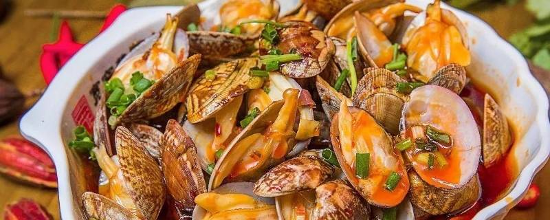 4、放入香葱、姜、蒜、花蛤翻炒。