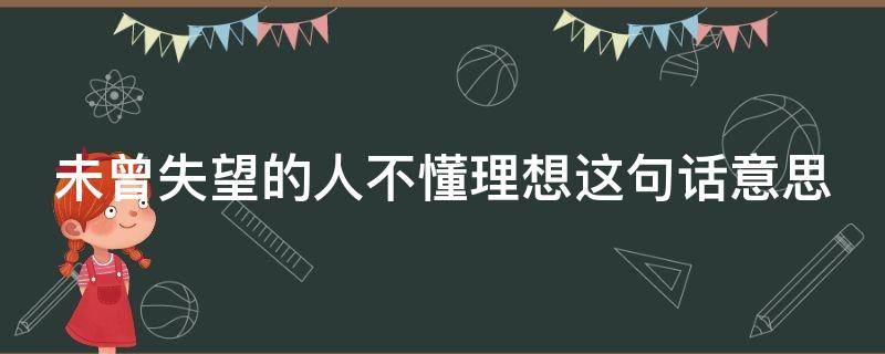 未曾失望的人不懂理想这句话的意思是没有失望过的人,不会懂得理想的。人的一路走过来,总不是想象中的那么好,每个人的背后都会有心酸,都会有无法言说的艰难,每个人都有自己的泪要擦,都有自己的路要走。要记得,跌倒了在伤痛中爬起,给自己一个宽容的微笑往前走,做最真实的自己。理想是对未来事物的美好想象和希望,也比喻对某事物臻于最完善境界的观念。是人们在实践过程中形成的、有实现可能性的、对未来社会和自身发展的向往和追求,是人们的世界观、人生观和价值观在奋斗目标上的集中体现。满足眼前的物质和精神需求,又憧憬未来的生活目标,期盼满足更高的物质和精神需求。对未来不懈追求,是理想形成的动力和源泉。
